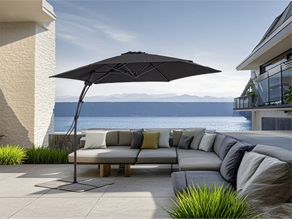 De nombreux parasols déportés, y compris les parasols suspendus décalés, sont inclinables et rotatifs. Cela garantit une couverture d'ombre complète, quel que soit l'angle ou la direction du soleil. Ainsi, même le matin ou le soir, le parasol peut offrir une ombre complète.