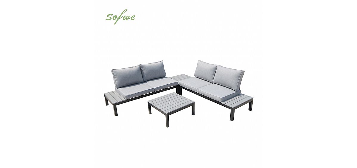 Avec des tables d'appoint et des rangements, l'ensemble de canapés d'extérieur en aluminium très vendu peut accueillir 4 personnes. Un cadre latéral en contreplaqué gris clair sert de rangement supplémentaire à chaque extrémité du canapé. Chaque membre de la famille peut trouver sa place préférée dans le salon d'angle, qui peut accueillir jusqu'à 4 personnes.