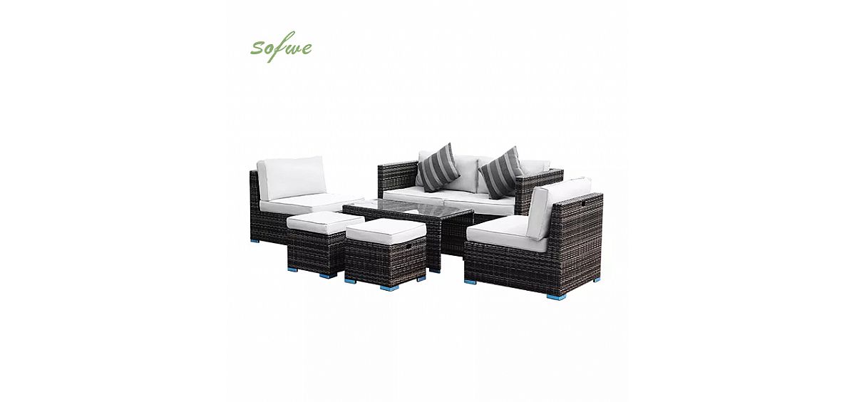 ensemble de meubles en rotin de 6 pièces comprend : 1 canapé deux places, 2 canapés une place, 2 tabourets, 1 table centrale avec verre —— peut être disposé séparément jusqu'à votre espace a besoin.