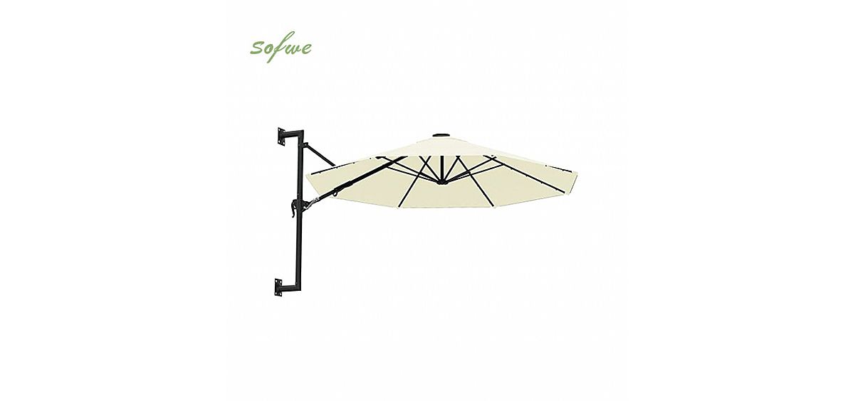 - Élégant et innovant, ce parapluie mural est construit avec un poteau en métal robuste et huit nervures, reliant l'auvent de protection UV carré de 10 pieds en polyester 180 g de qualité supérieure. C'est la taille parfaite pour vous couvrir, vous et votre table de patio, sans obstruer la vue.